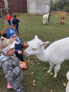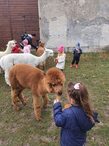 18.10 2022r dzieci z grupy ,,Marynarze" wybrali się na wycieczkę do Dziadkowizny Skalno .Organizatorzy przygotowali wiele atrakcji. Na dzieci czekały nie tylko alpaki ale także inne zwierzęta kury, kozy, kucyki które chętnie dawały się karmić. Po obcowaniu że zwierzętami przyszedł. Czas na pracę manualną. Powstało wiele portretów alpak wykonanych z prawdziwej alpaczej wełny. Nie zabrakło również ogniska z kiełbaskami oraz ciepłym soczkiem przyrządzonym przez właścicieli gospodarstwa Pozostały czas dzieci spedziły na zabawach ruchowych na świeżym powietrzu.