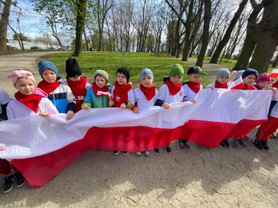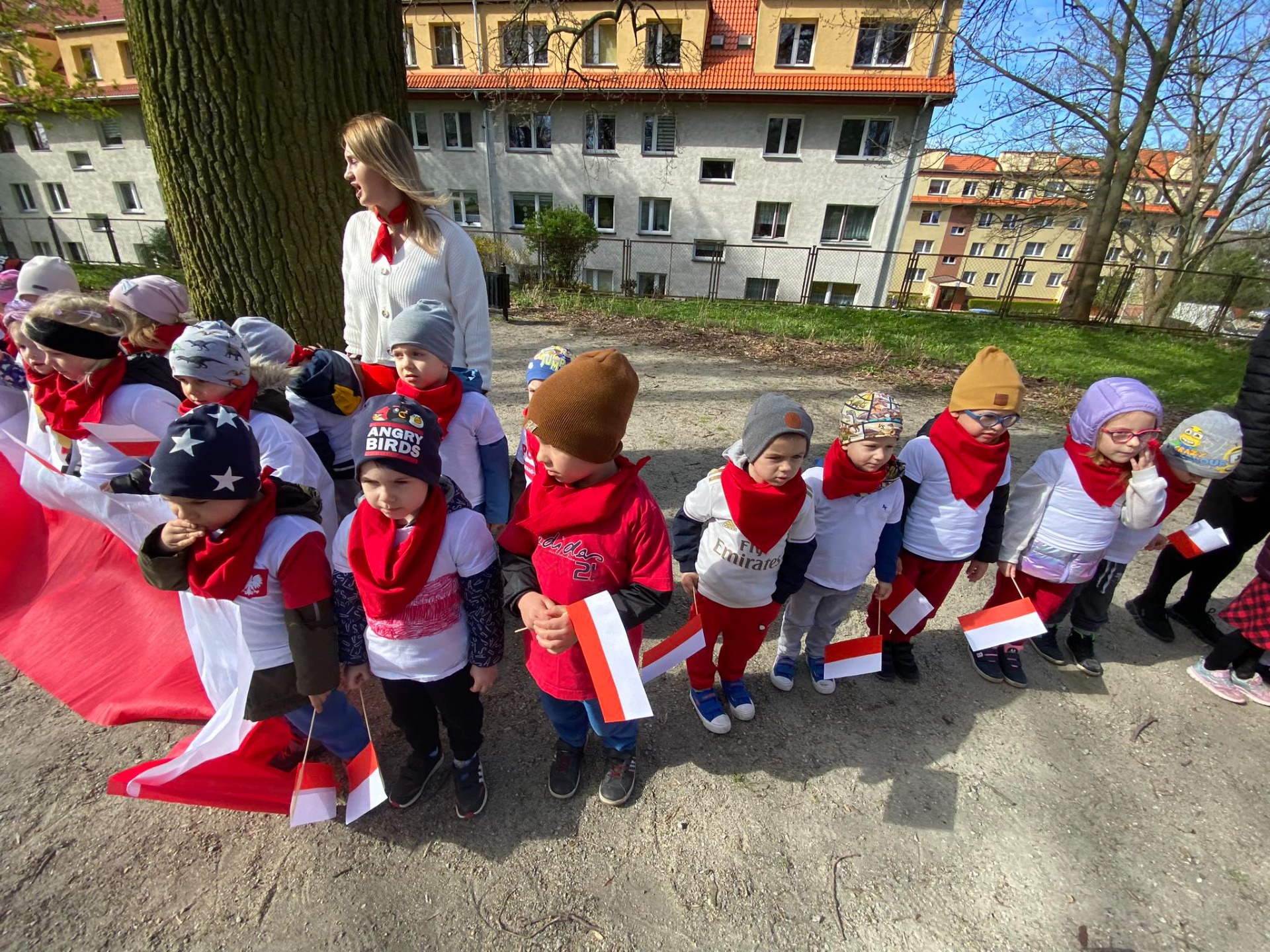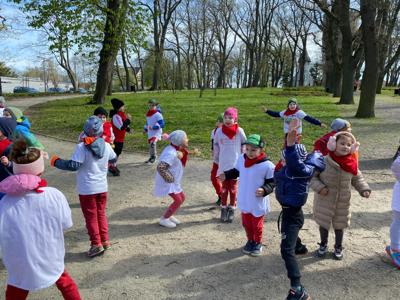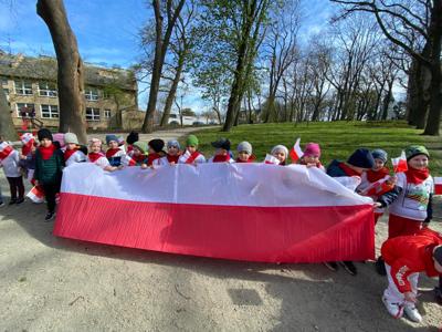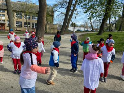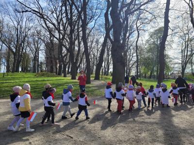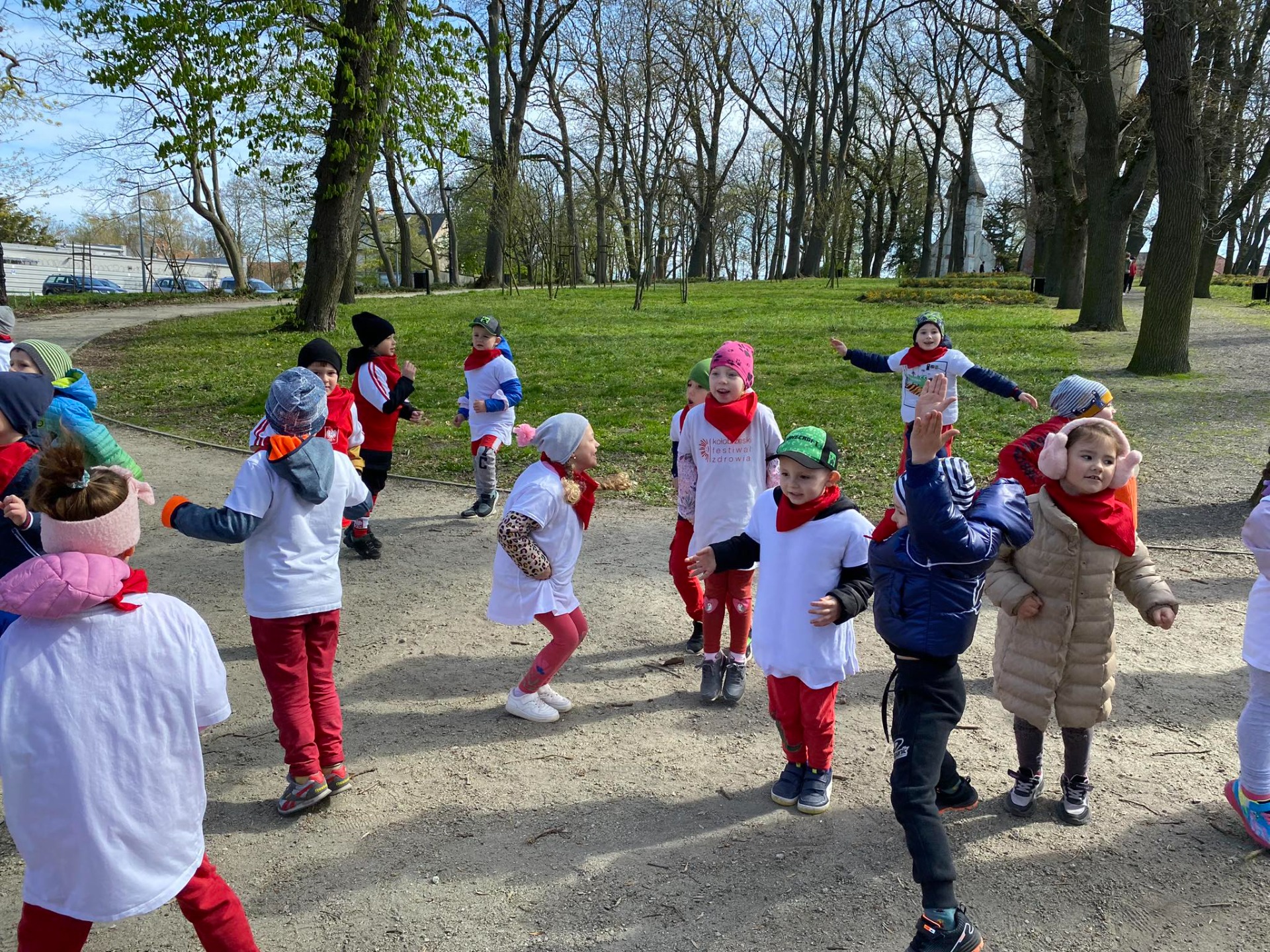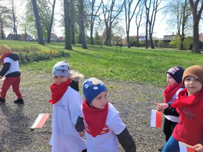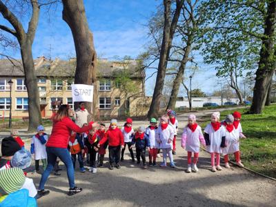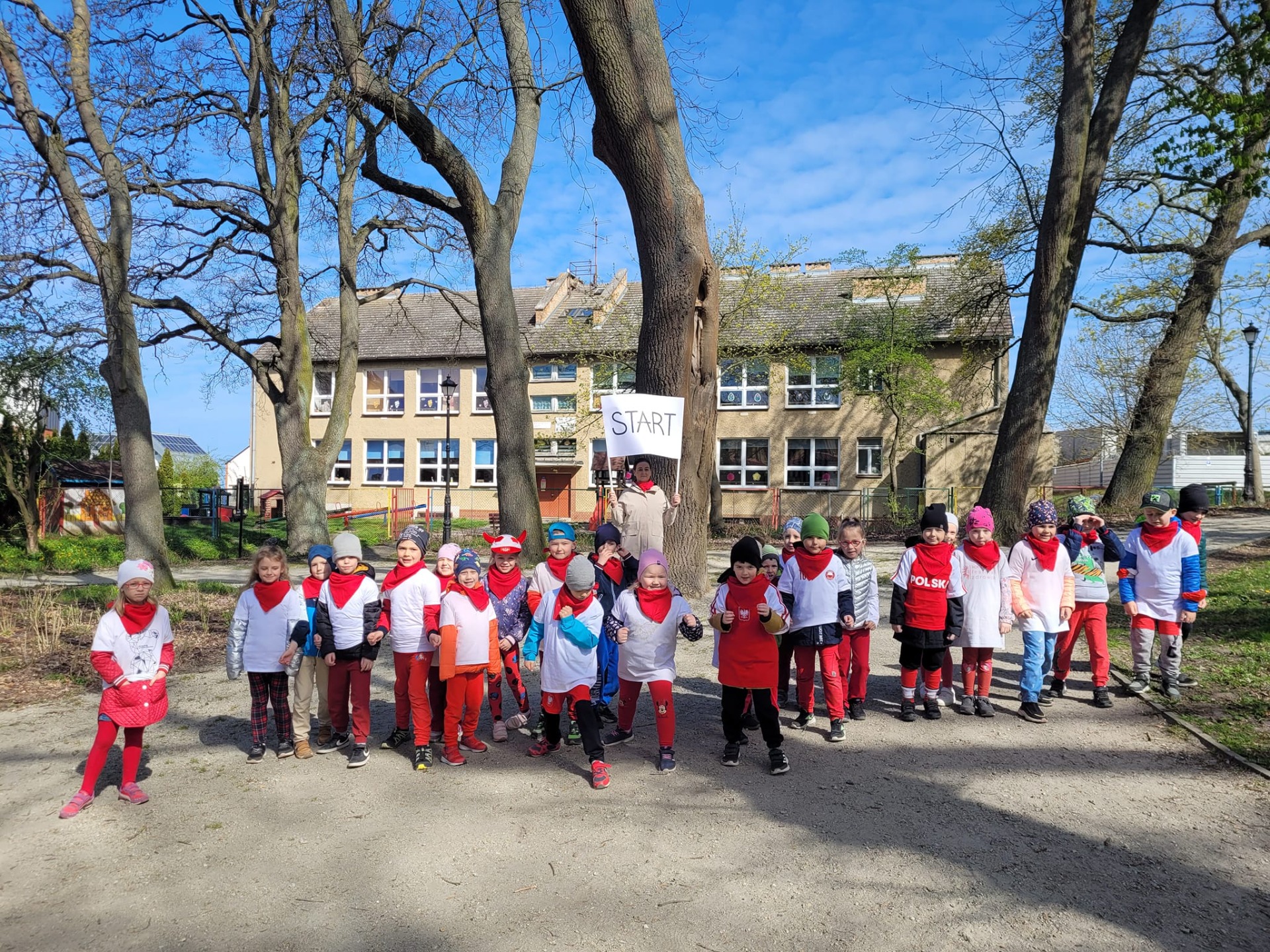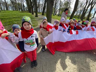 Z okazji zbliżającego się święta Uchwalenia Konstytucji 3 maja w naszym przedszkolu zorganizowany został bieg patriotyczny. Na początku dzieci wraz z paniami przeszły alejkami parku miejskiego wymachując flagami. Następnie wszyscy uroczyście odśpiewali hymn państwowy. Po wprowadzeniu dzieci i omówieniu z jakiej okazji zorganizowany został bieg przystąpiliśmy do energicznej rozgrzewki. Gdy wszyscy się rozruszali rozpoczęły się wyścigi. Przedszkolaki startowały kolejno w swoich grupach. Panie także dołączyły do biegu, w którym pierwsze miejsce zajęła p. Ewa Frydrychowska. Na zakończenie wszyscy uczestnicy otrzymali wielkie brawa i puchary za uczestnictwo w biegu. Organizacja biegu miała na celu wprowadzenie najmłodszych w świat wartości oraz rozbudzenie w nich poczucia miłości, szacunku i przynależności do swojej Ojczyzny.