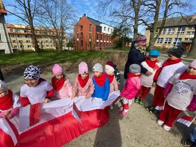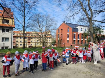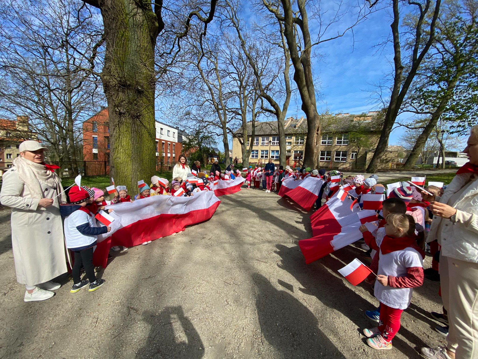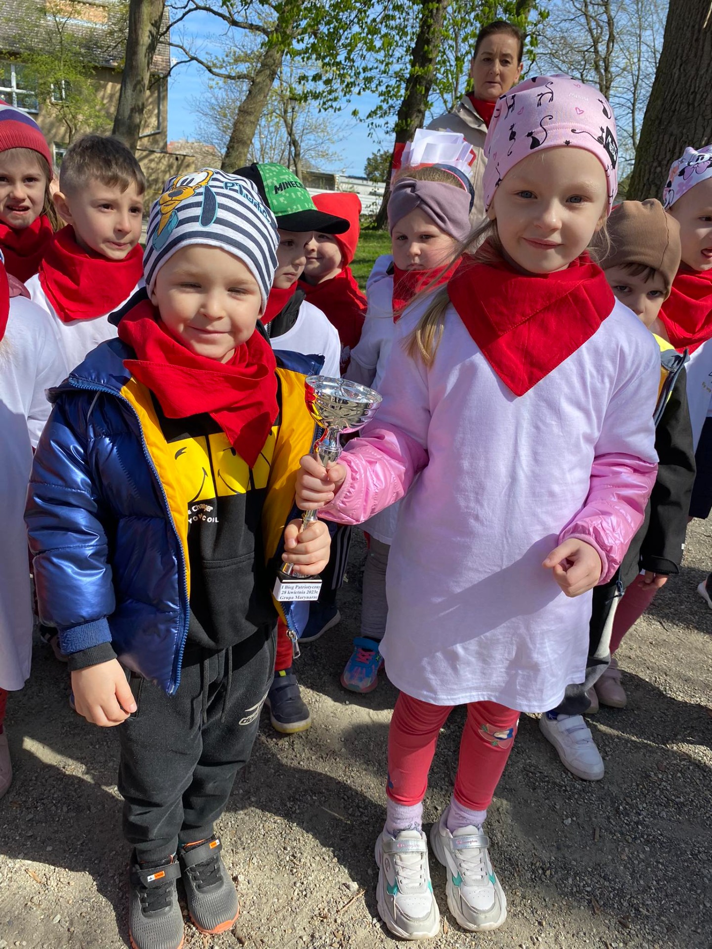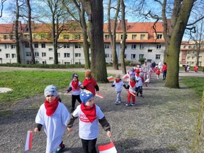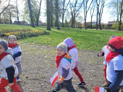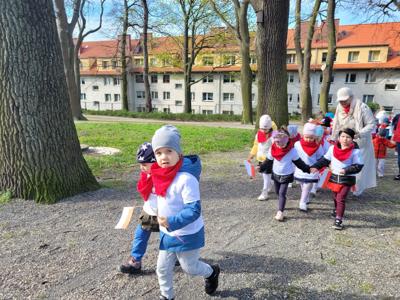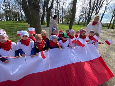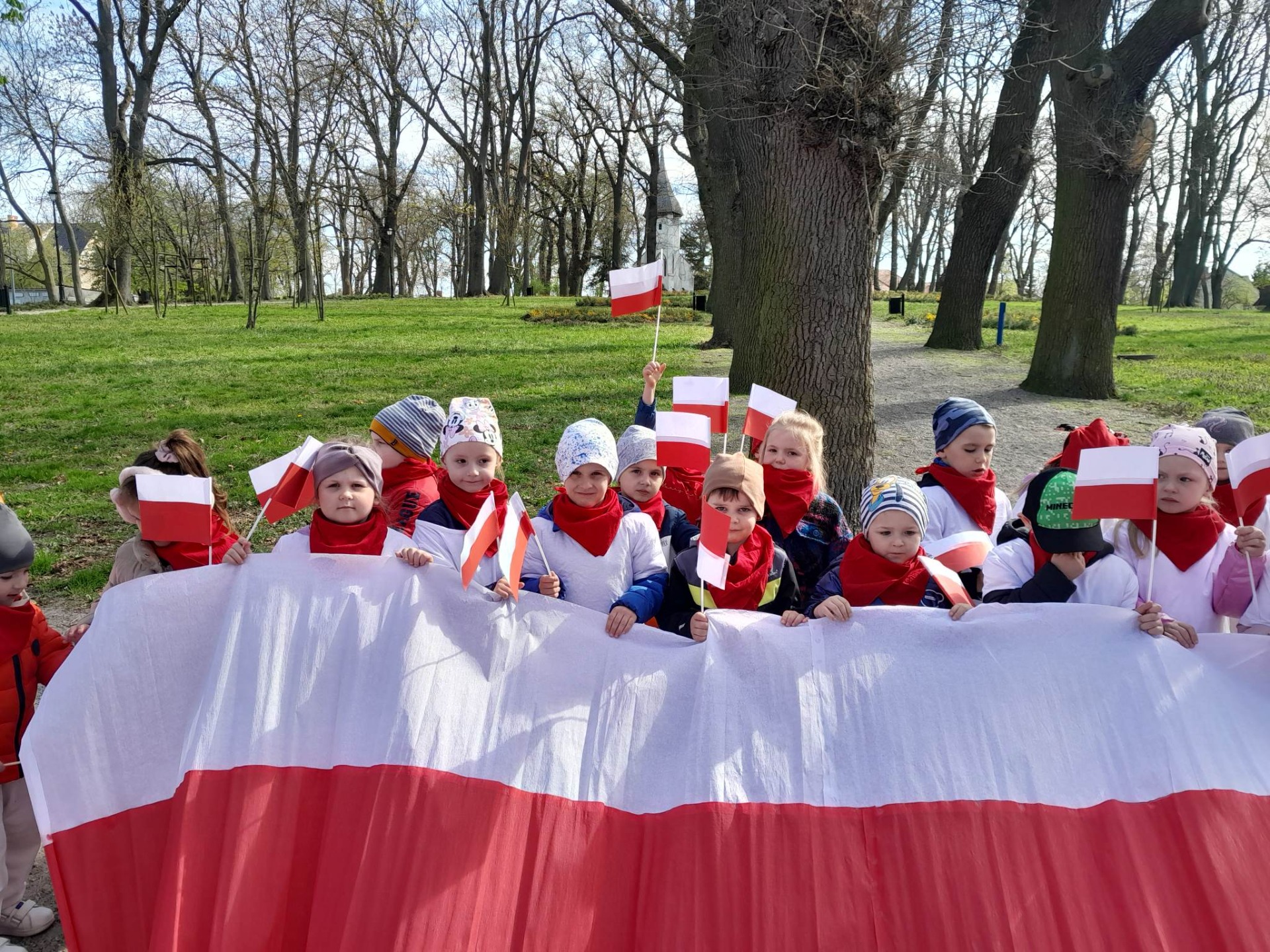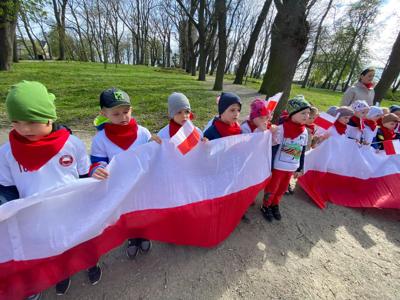 Z okazji zbliżającego się święta Uchwalenia Konstytucji 3 maja w naszym przedszkolu zorganizowany został bieg patriotyczny. Na początku dzieci wraz z paniami przeszły alejkami parku miejskiego wymachując flagami. Następnie wszyscy uroczyście odśpiewali hymn państwowy. Po wprowadzeniu dzieci i omówieniu z jakiej okazji zorganizowany został bieg przystąpiliśmy do energicznej rozgrzewki. Gdy wszyscy się rozruszali rozpoczęły się wyścigi. Przedszkolaki startowały kolejno w swoich grupach. Panie także dołączyły do biegu, w którym pierwsze miejsce zajęła p. Ewa Frydrychowska. Na zakończenie wszyscy uczestnicy otrzymali wielkie brawa i puchary za uczestnictwo w biegu. Organizacja biegu miała na celu wprowadzenie najmłodszych w świat wartości oraz rozbudzenie w nich poczucia miłości, szacunku i przynależności do swojej Ojczyzny.