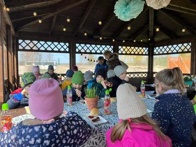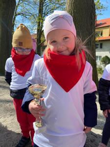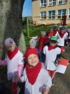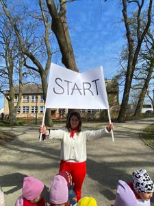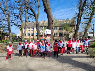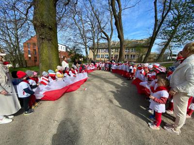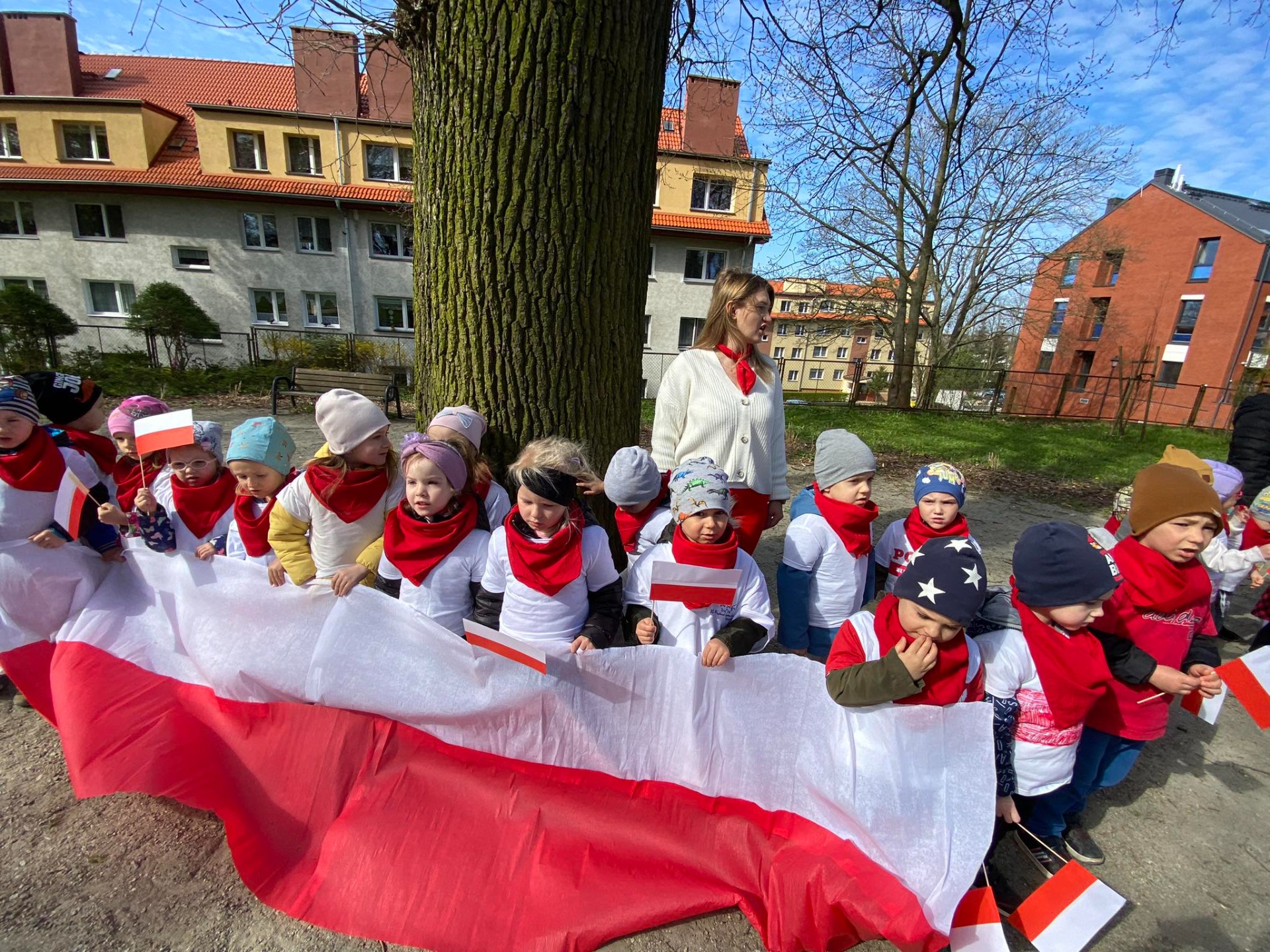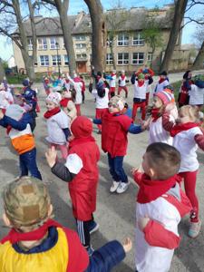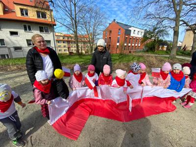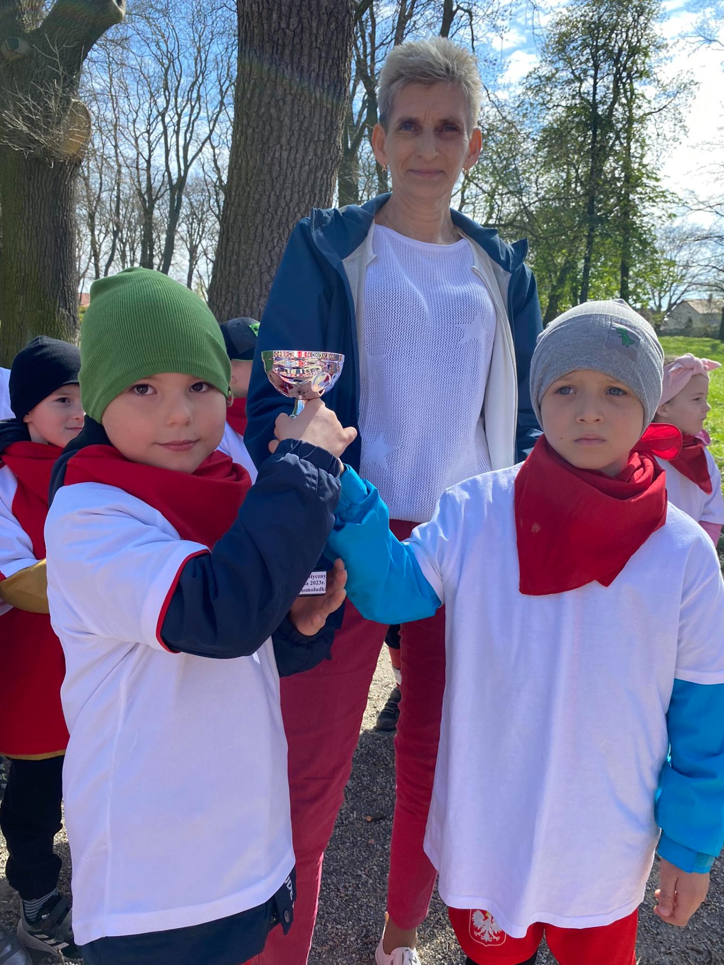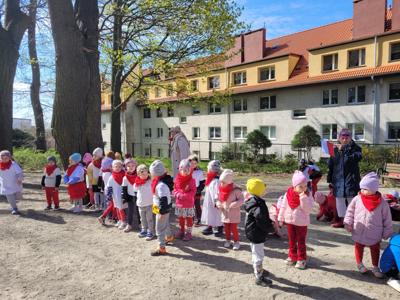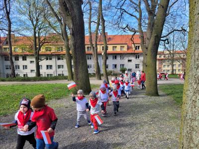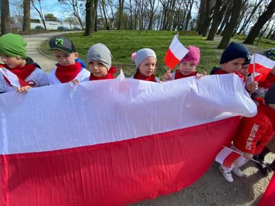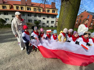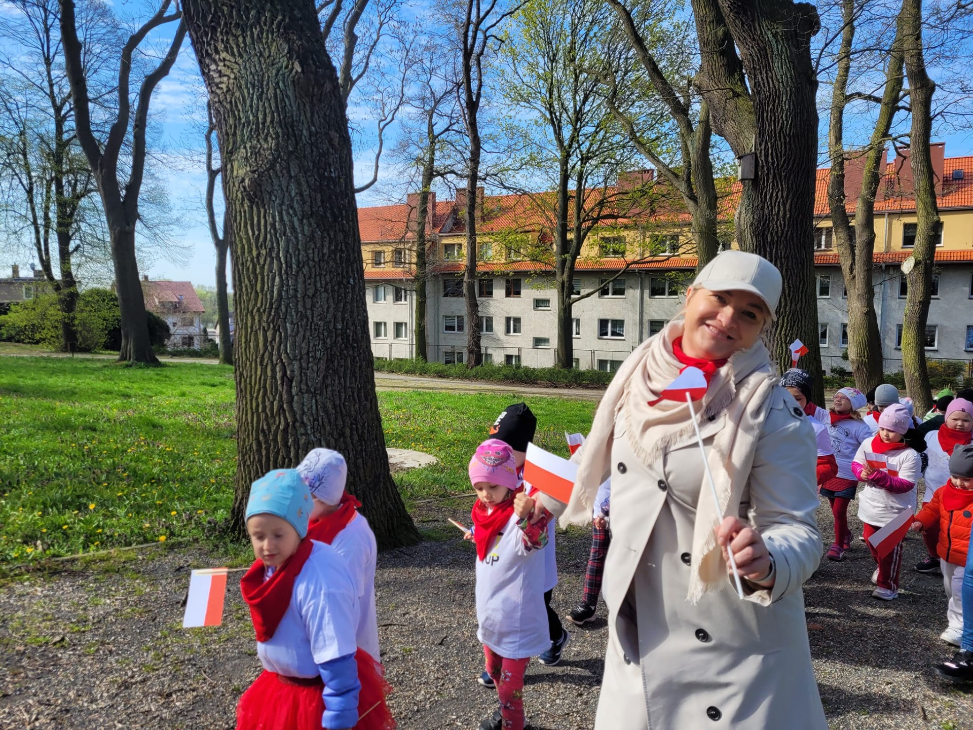 Z okazji zbliżającego się święta Uchwalenia Konstytucji 3 maja w naszym przedszkolu zorganizowany został bieg patriotyczny. Na początku dzieci wraz z paniami przeszły alejkami parku miejskiego wymachując flagami. Następnie wszyscy uroczyście odśpiewali hymn państwowy. Po wprowadzeniu dzieci i omówieniu z jakiej okazji zorganizowany został bieg przystąpiliśmy do energicznej rozgrzewki. Gdy wszyscy się rozruszali rozpoczęły się wyścigi. Przedszkolaki startowały kolejno w swoich grupach. Panie także dołączyły do biegu, w którym pierwsze miejsce zajęła p. Ewa Frydrychowska. Na zakończenie wszyscy uczestnicy otrzymali wielkie brawa i puchary za uczestnictwo w biegu. Organizacja biegu miała na celu wprowadzenie najmłodszych w świat wartości oraz rozbudzenie w nich poczucia miłości, szacunku i przynależności do swojej Ojczyzny.