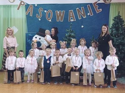 15 grudnia dzieci z grupy Misie uczestniczyły w bardzo ważnej uroczystości, którą było Pasowanie na Przedszkolaka. Na początku maluszki zaprezentowały rodzicom część artystyczną, którą dokładnie przygotowały przez kilka miesięcy. Następnie Pani Dyrektor oficjalnie włączyła wszystkie dzieci do przedszkolnej społeczności. Po części oficjalnej przedszkolaki wraz ze swoimi rodzicami udały się do sali na słodki poczęstunek. Ten dzień z pewnością zostanie w pamięci najmłodszych przez długi czas.