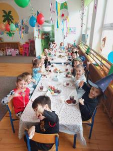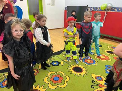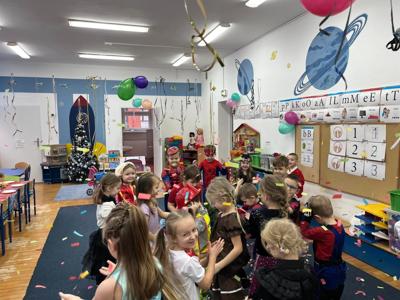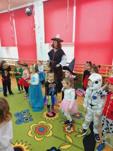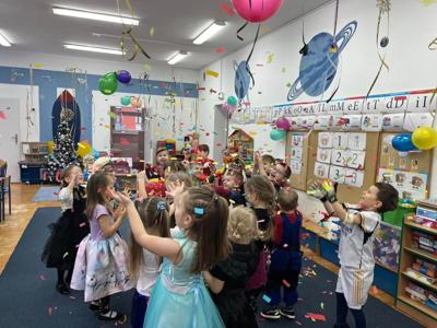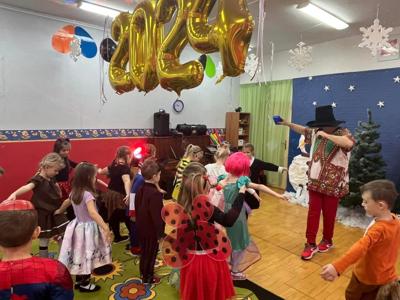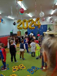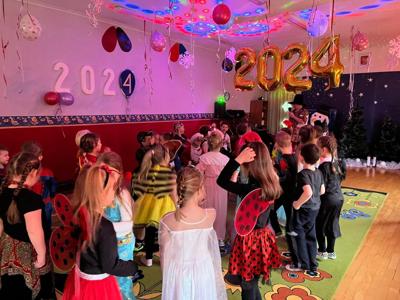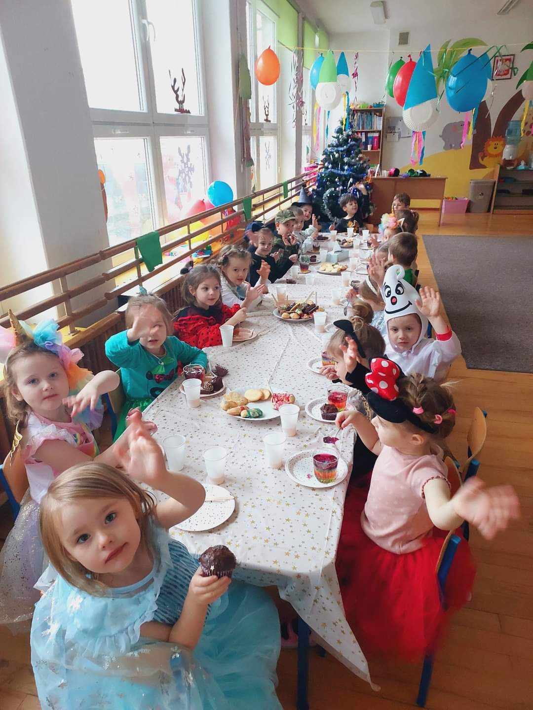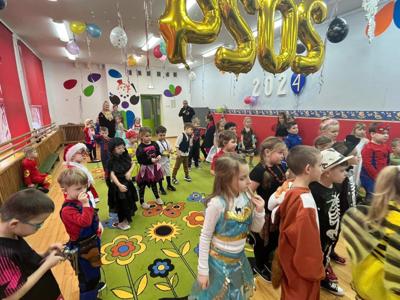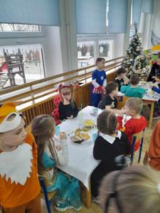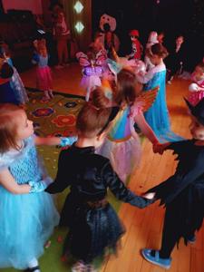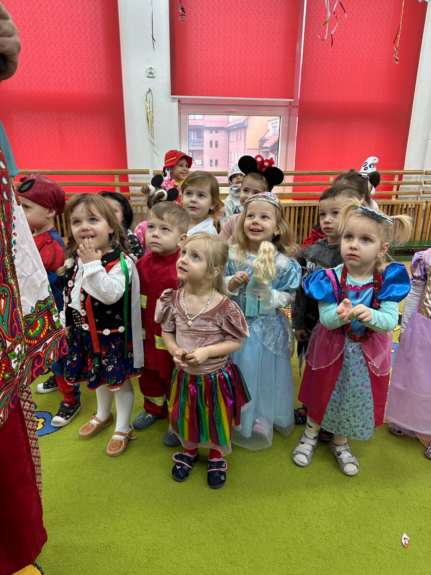 Nastał czas karnawału, zabawy i radości. Przedszkolaki podtrzymując coroczną tradycję przybyły do przedszkola w kolorowych strojach, balowych sukniach i bajecznych przebraniach. Wszyscy z ogromnym zachwytem zebrali się w dużej sali i rozpoczęli tańce. Śmiechu, szaleństwa i zabawy nie było końca. Na zakończenie balu każda grupa wykonała pamiątkowe zdjęcia, a dzieci rozeszły się do swoich sal na słodki poczęstunek.