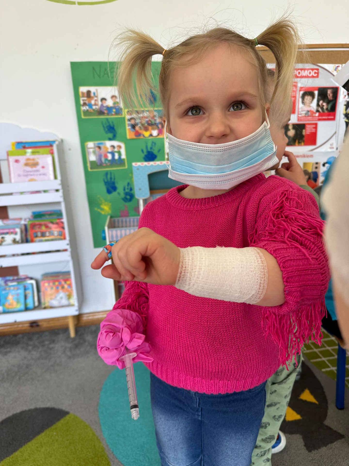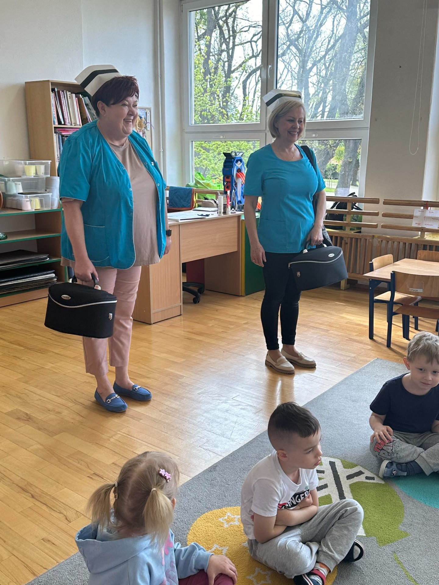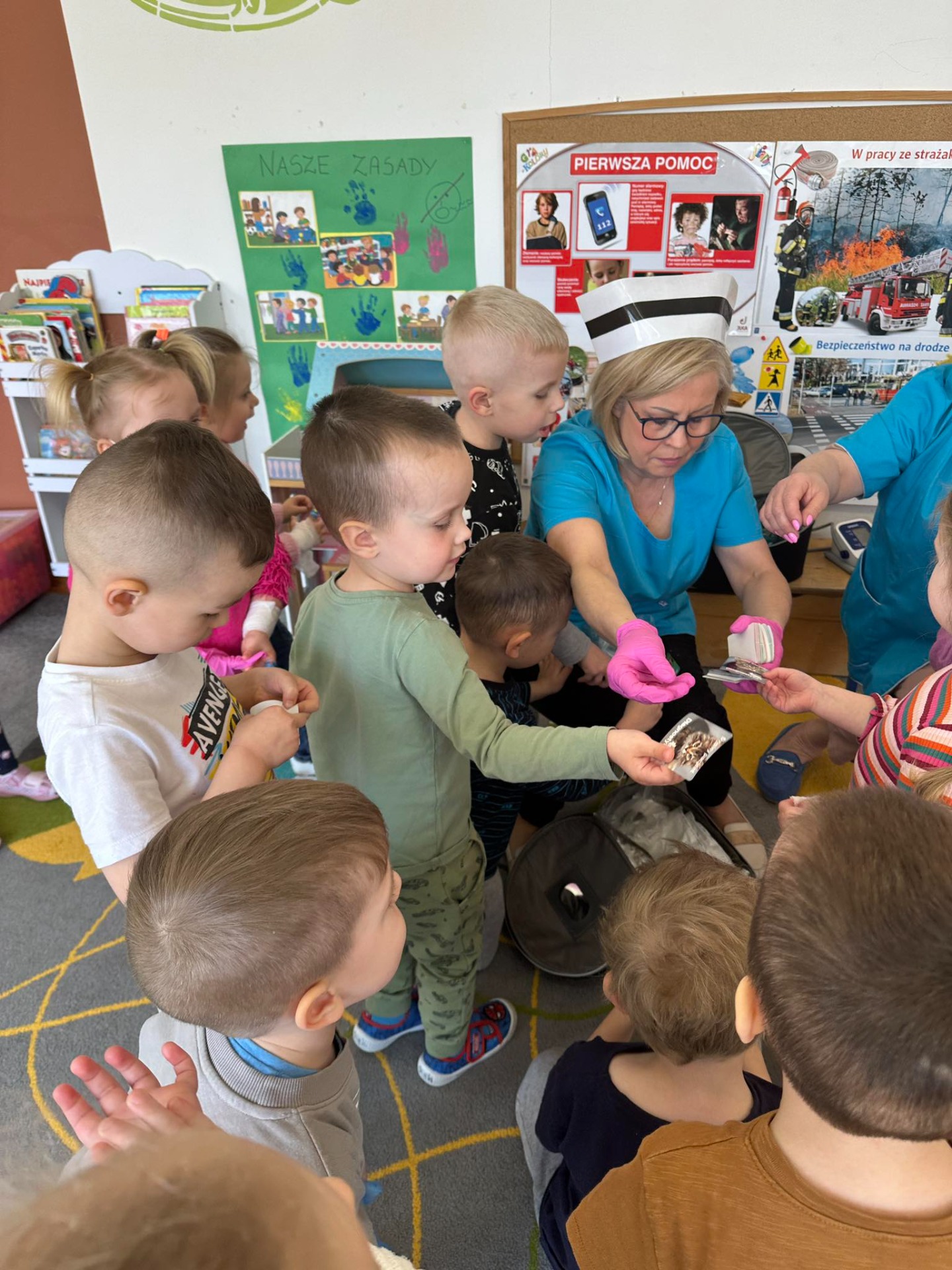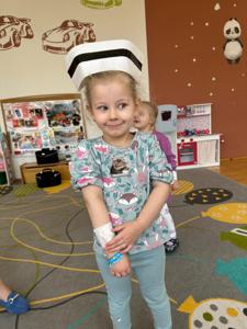 Dziś nasze maluszki odwiedzili niezwykli goście, a były nimi Panie Pielęgniarki. Podczas spotkania Panie w bardzo ciekawy sposób przedstawiły dzieciom zarys swej pracy i podkreśliły jak ważną rolę pełnią. Przedszkolaki miały możliwość przymierzyć maskę ochronną oraz bandaż. Podjęły także próby samodzielnego opatrzenia rannej maskotki. Na zakończenie starannie obejrzały akcesoria, które na co dzień pielęgniarki wykorzystują w swej pracy i dowiedziały się do czego służą. Dzięki tym zajęciom najmłodsi wzbogacili i utrwalili wiadomości na temat sposobów dbania o swoje zdrowie. Mamy nadzieję, że po spotkaniu dzieci raz na zawsze pokonały lęk przed zabiegami medycznymi.