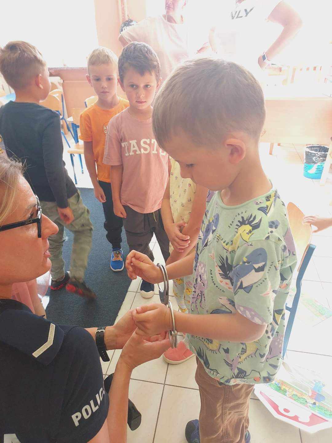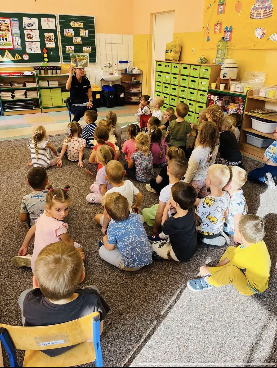 W pierwszych dniach września mury przedszkola przekroczyły Panie Policjantki. Przeprowadziły one pogadankę z dziećmi na temat bezpieczeństwa. Maluchy dowiedziały się jak bezpiecznie poruszać się po drodze, a także utrwaliły zasady poprawnego przechodzenia przez ulicę. Na zakończenie spotkania chętne dzieci mogły obejrzeć policyjne akcesoria. Najwięcej radości wzbudziła zabawa kajdankami. Miejmy nadzieję, że po tym spotkaniu przedszkolaki będą potrafiły wprowadzić podstawy teoretyczne w swoją codzienność.