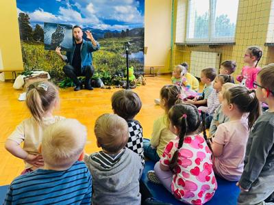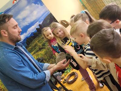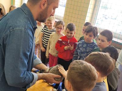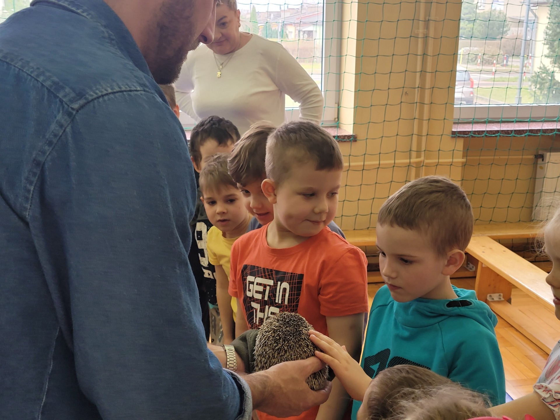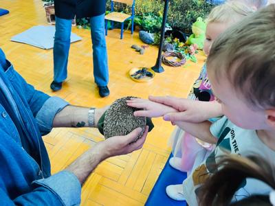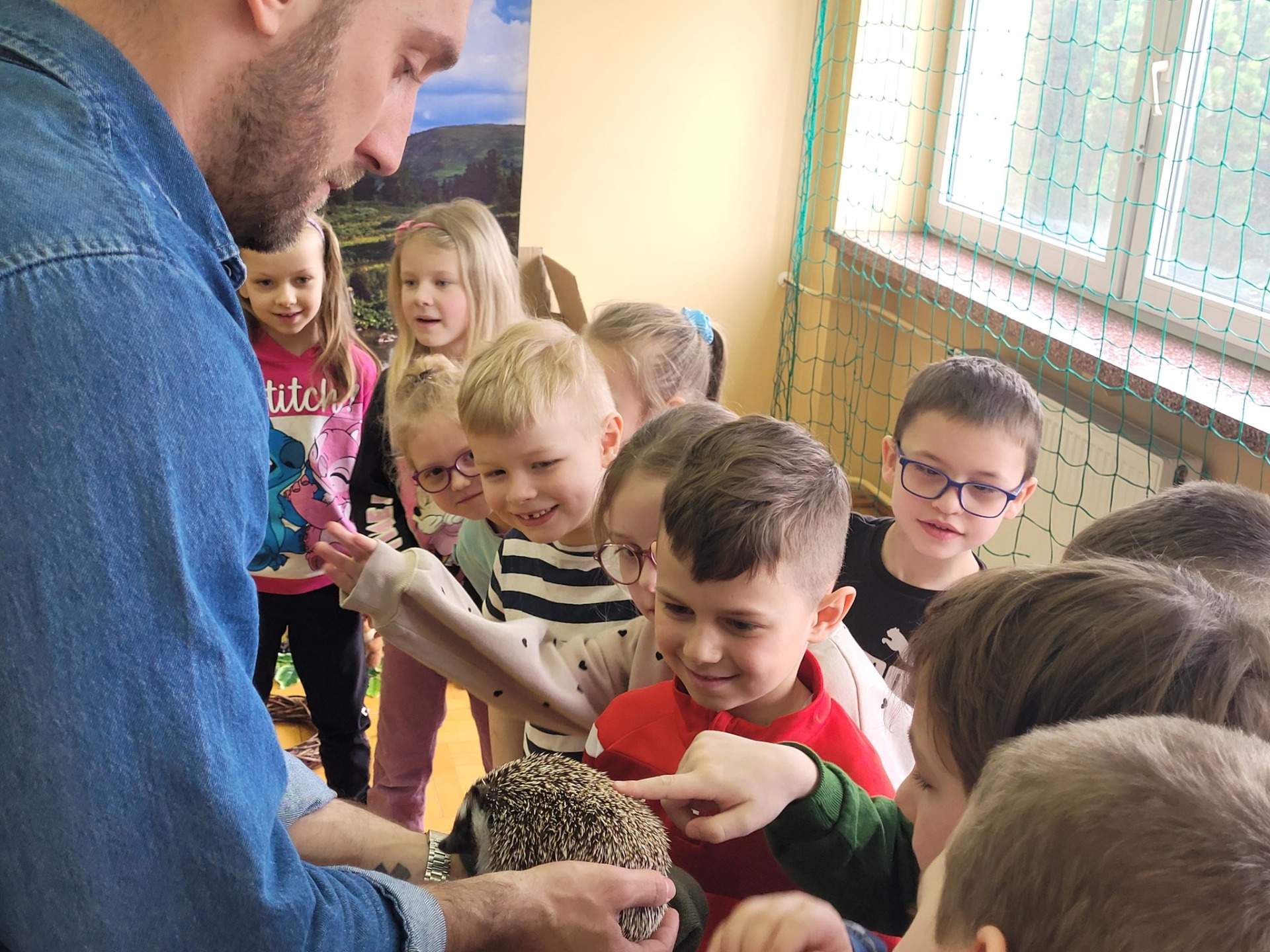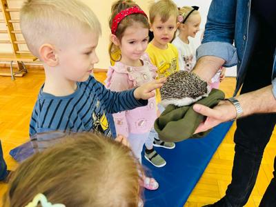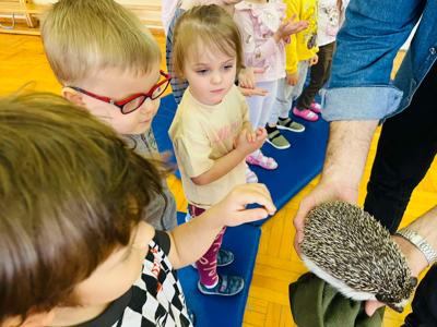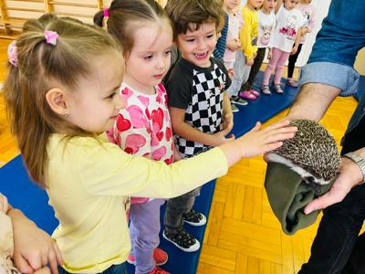 Ciekawość świata to jedna z głównych cech charakteryzująca najmłodszych. Aby rozwijać w nich zainteresowanie światem przyrody i uwrażliwić na dbanie o nią, zorganizowaliśmy w naszym przedszkolu warsztaty pt.: Dzień z życia jeża. Dzieci dowiedziały się jak wyglądają poszczególne etapy w rozwoju jeża i jego dorosłym życiu. Przedszkolaki poznały jak jeże radzą sobie z zagrożeniem, gdzie znajdują schronienie oraz czym się odżywiają. Prowadzący zwrócił uwagę na to jak wielkim zagrożeniem dla tych bezbronnych zwierząt może stać się człowiek. Na zakończenie spotkania każdy chętny przedszkolak mógł zapoznać się z prawdziwą, małą Jeżynką oraz pogłaskać ją. Wszyscy zgromadzeni z zainteresowaniem słuchali przyrodniczych ciekawostek.