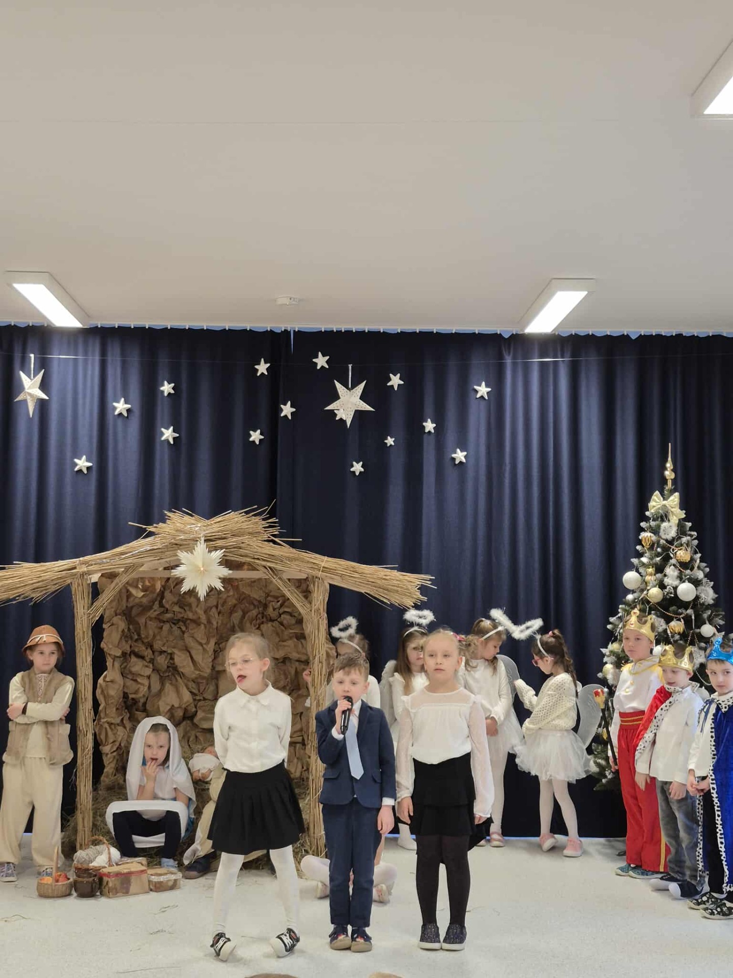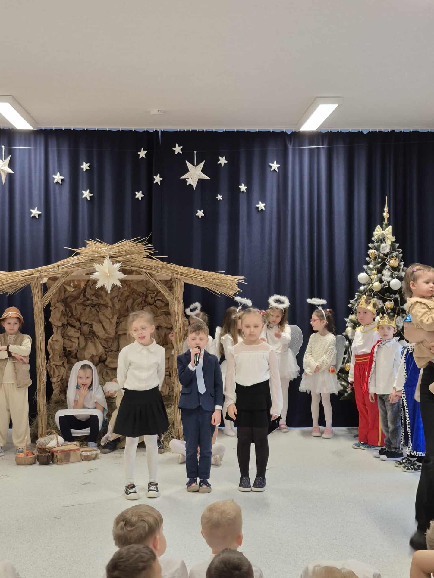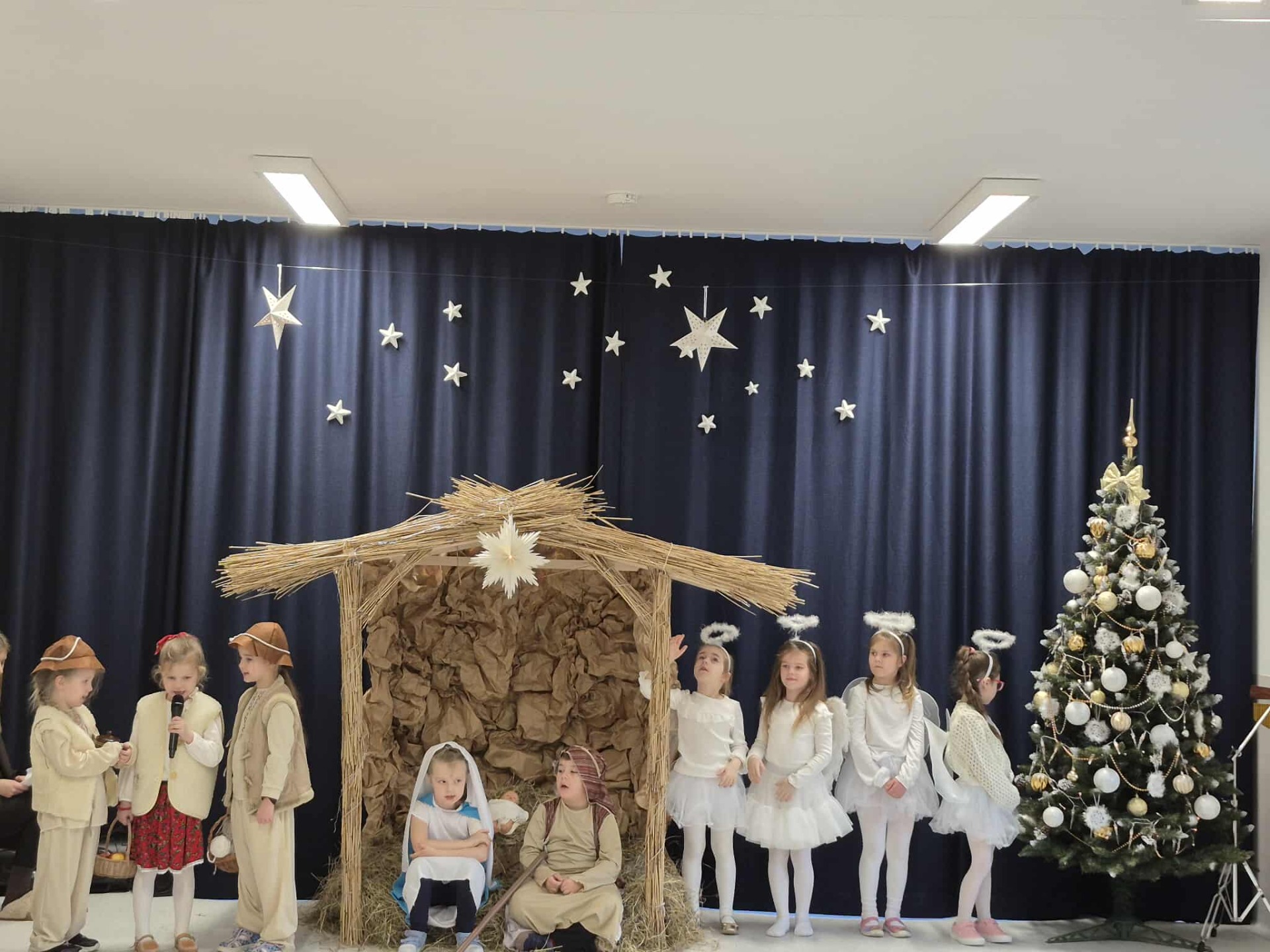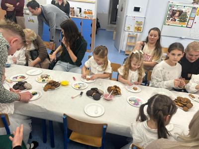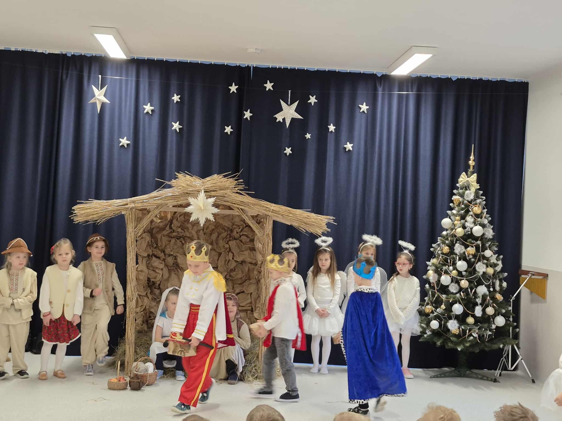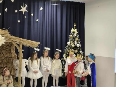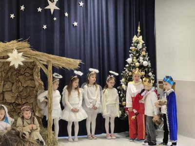 Tradycją naszego przedszkola jest przygotowanie i wystawienie w okresie przedświątecznym Jasełek. Przedstawienie jasełkowe w wykonaniu przedszkolaków wprowadziły całą społeczność przedszkolną w świąteczny czas. Świąteczny nastrój podkreślały odświętne stroje dzieci i przepiękna dekoracja sceny. Mali aktorzy z wielkim przejęciem wygłaszali swoje role i radośnie śpiewali kolędy i pastorałki. Po występach dzieci wraz z rodzicami udały się do swoich sal, aby wspólnie świętować. Przedszkolaki ozdabiały świątecznie pierniczki i wzięły udział w sesji zdjęciowej. To był bardzo rodzinny czas, spotkanie, które bardzo zbliżyło nas do siebie.